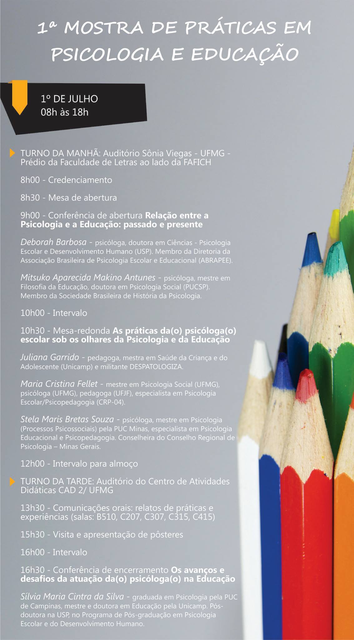 I Mostra de Práticas em Psicologia e EducaçãoXIV Plenário 464843062_8534687379934310_1481002987917063219_n Baixar Nome do EventoI Mostra de Práticas em Psicologia e EducaçãoTipo do eventoMostraComissão responsávelComissão de Orientação em Psicologia Escolar e EducacionalData01/07/2016EstadoMinas GeraisCidadeBelo HorizontePlenárioXIV PlenárioAssuntosEducação | Psicologia e Educação | Psicologia Escolar e Educacional Item anteriorI Mostra de Práticas em Psicologia e Educação Próximo itemI Mostra de Práticas em Psicologia e Educação